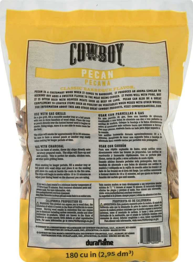 Cowboy® 100% all natural pecan wood chips add a smoky flavor to your grilled foods. The mellow, nutty aroma of pecan wood enhances the flavor of any food, but pairs particularly well with chicken and seafood. Like all Cowboy® wood chips, these pecan wood chips burn more quickly than chunks, making them perfect for shorter cook times.