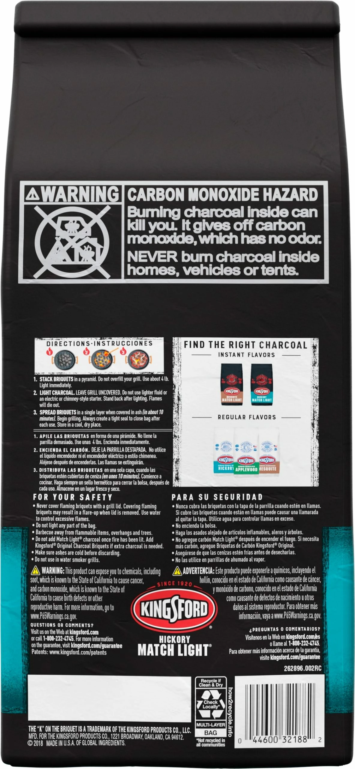 - NO LIGHTER FLUID: Made with high quality ingredients and real wood, just light a match to the coals – no lighter fluid needed -Each 4 pound bag of Match Light Hickory Instant Charcoal generates about 1 use