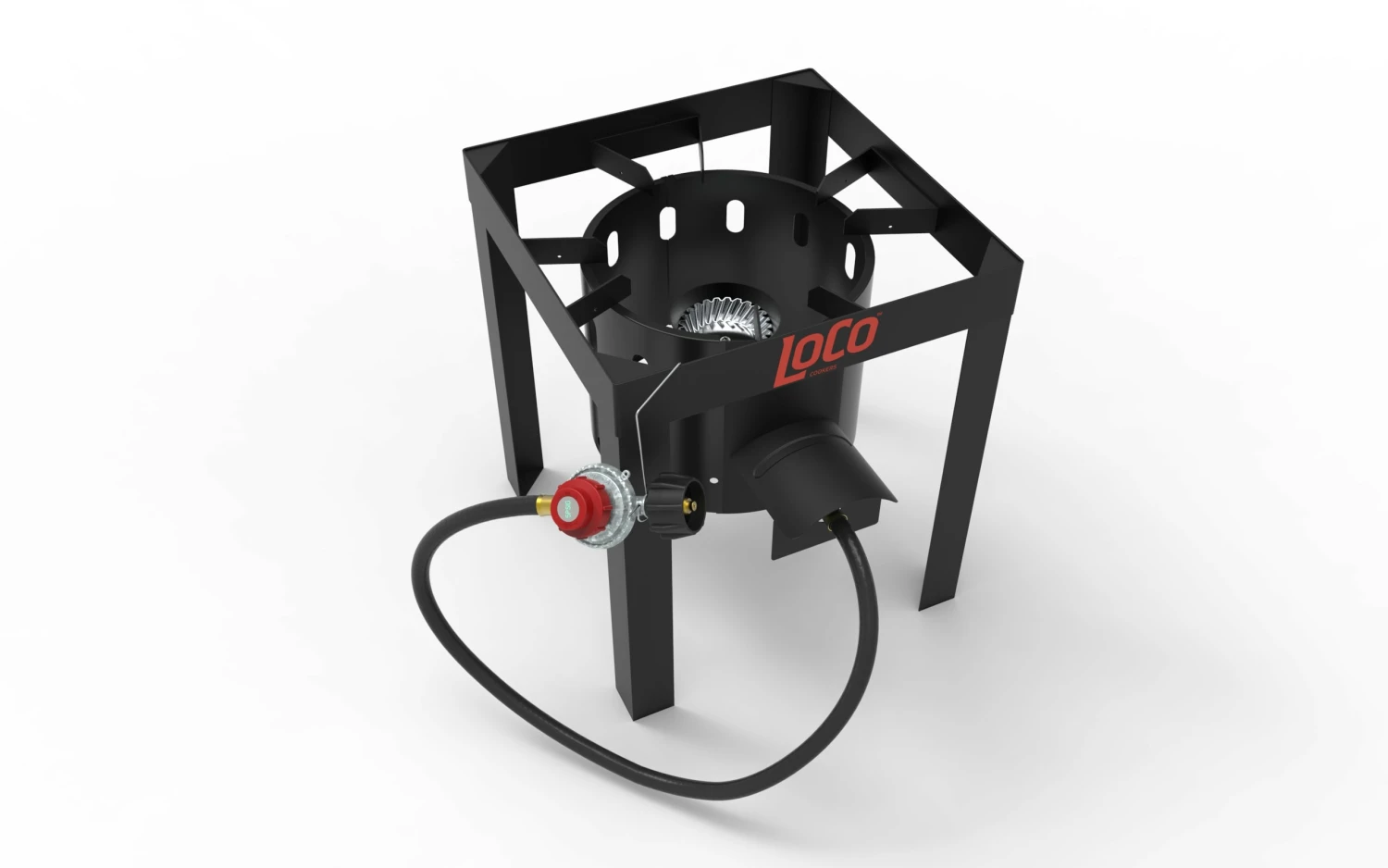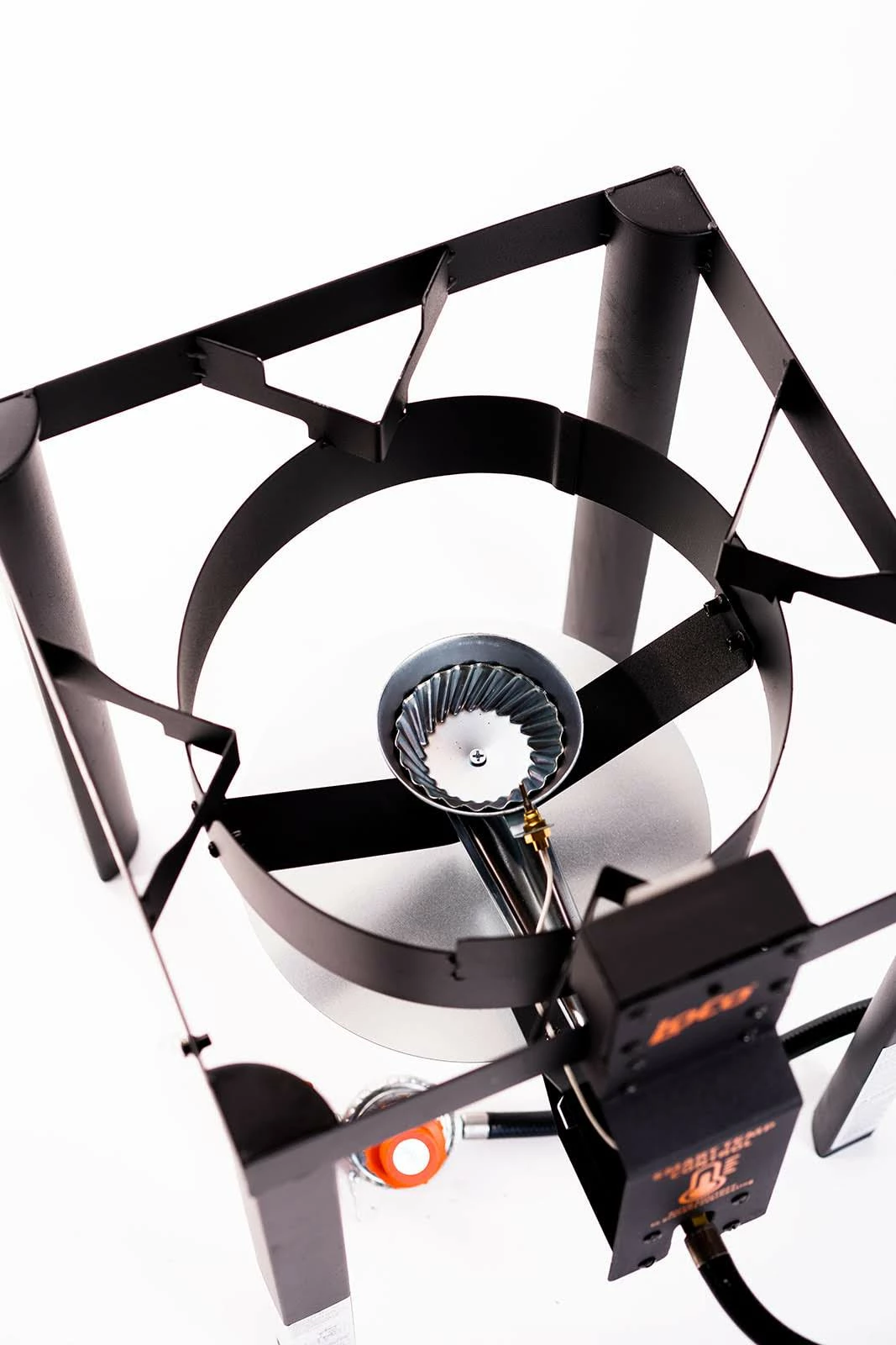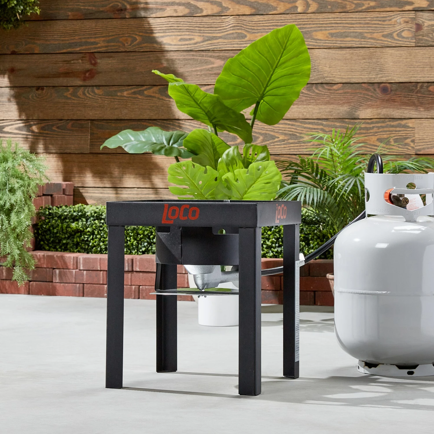 This powerful solid cast iron burner cranks up the temps! The sturdy, all-welded 4-leg steel stand offers maximum durability. With 50,000 BTU heat output, the LoCo high pressure frying stand heats up quickly, so you can get to frying. The built-in hose shield prevents heat from melting the hose in windy conditions.