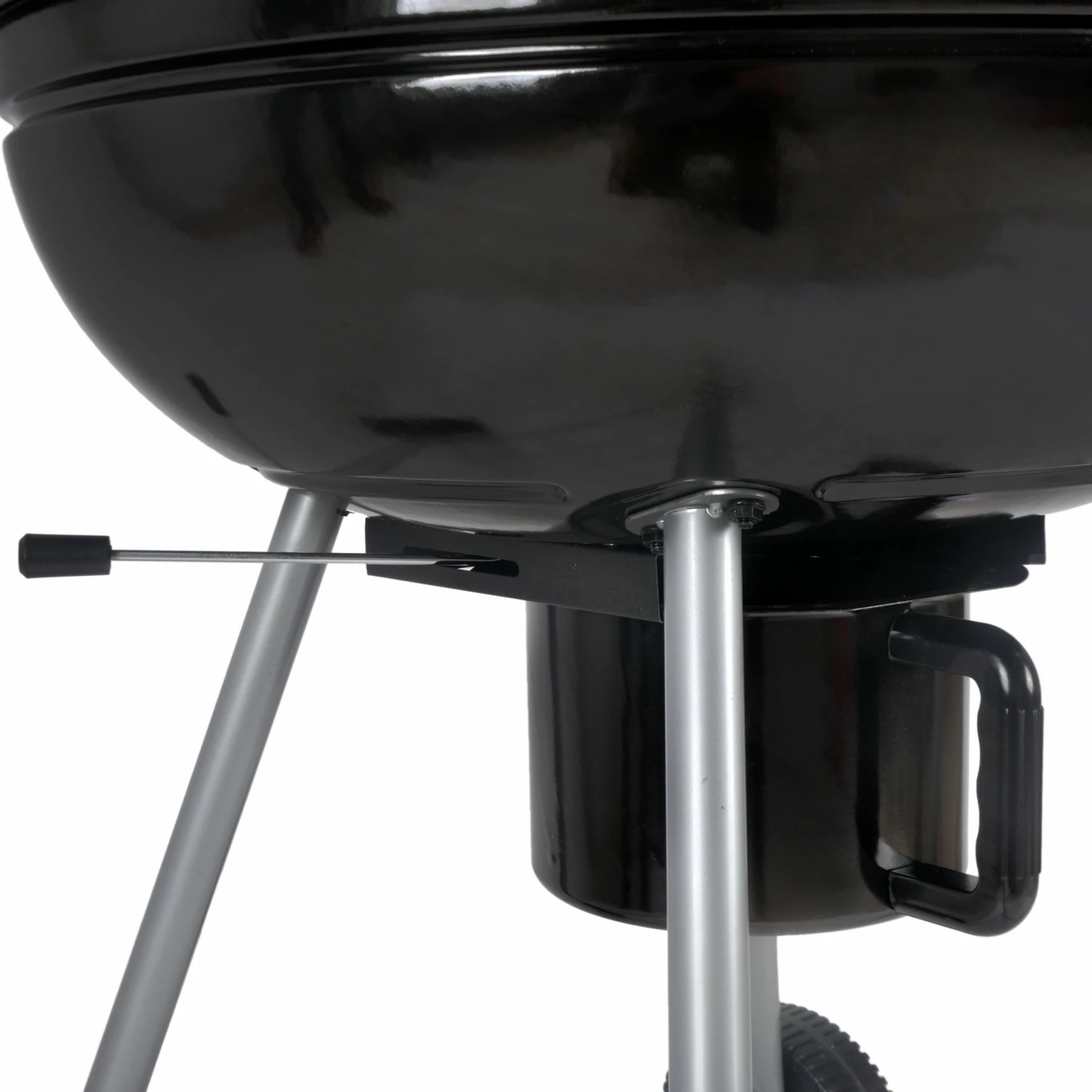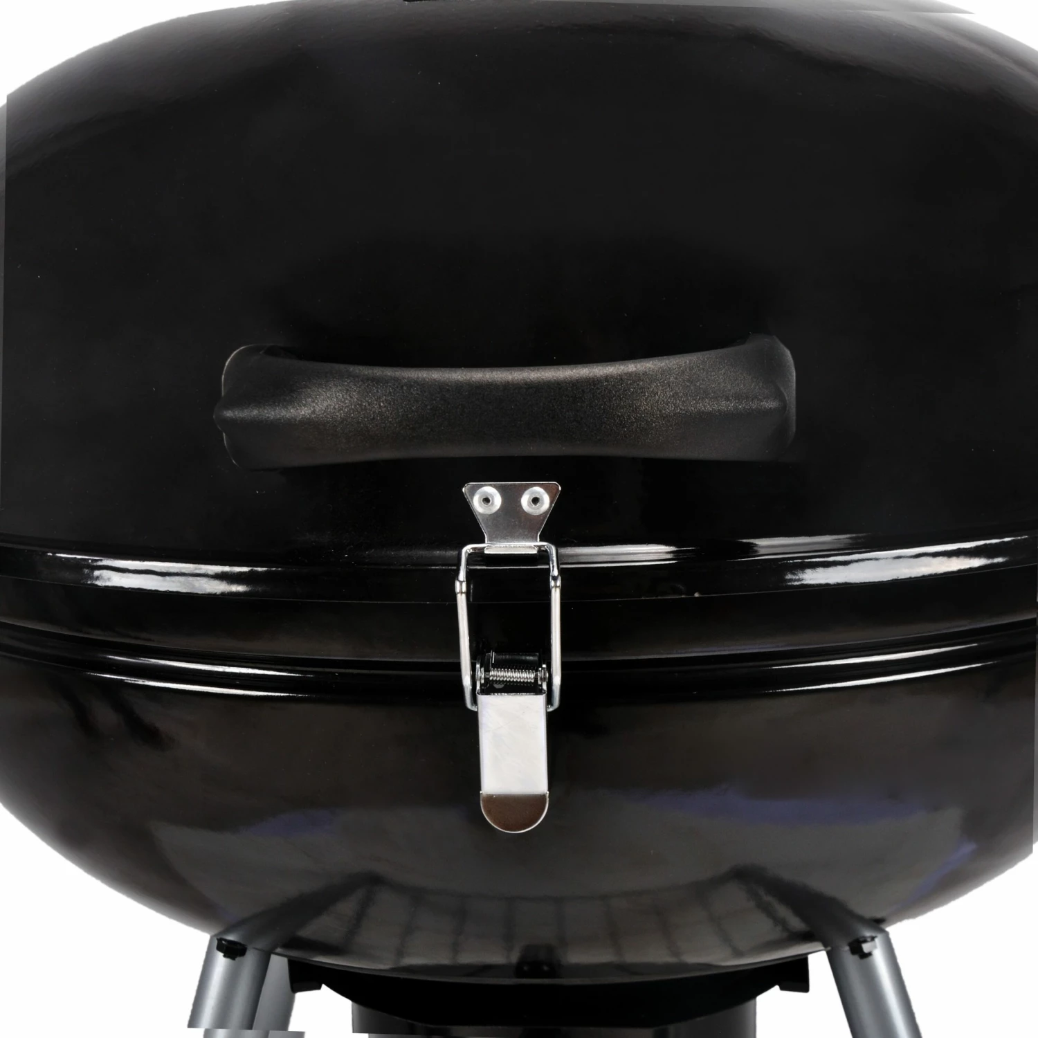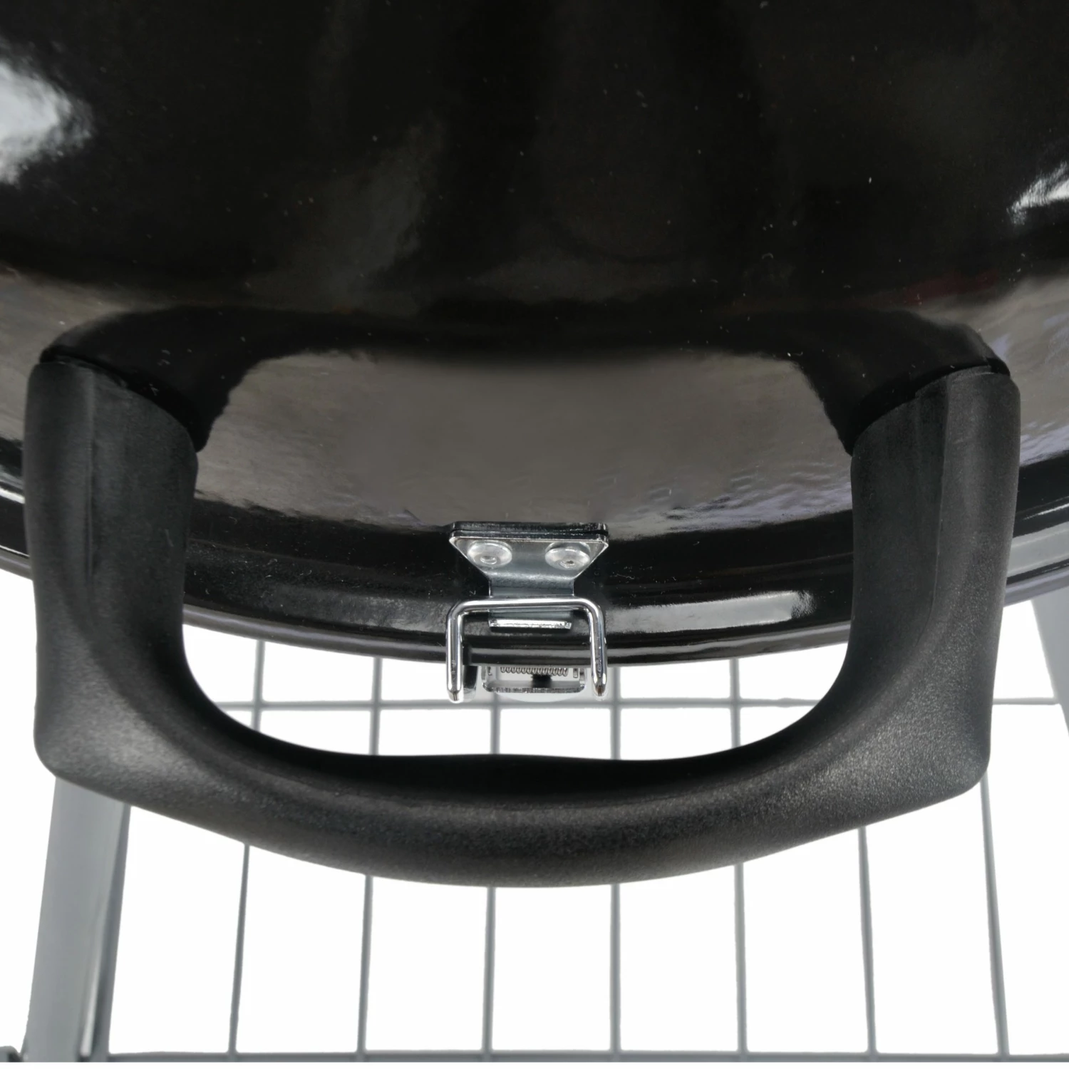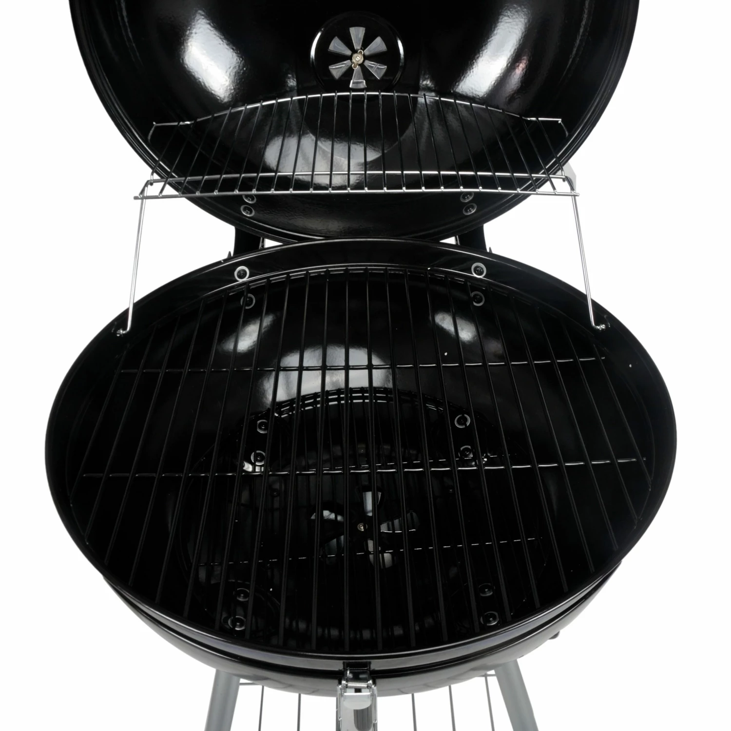 The Mr. Bar-B-Q 22-in charcoal grill has a total of 540-sq in cooking area, cook up to 27 burgers at a time. Built in temperature gauge and adjustable air vents for temperature control. Bottom storage shelf offer extra space. The wheels make transporting easy for your next event.