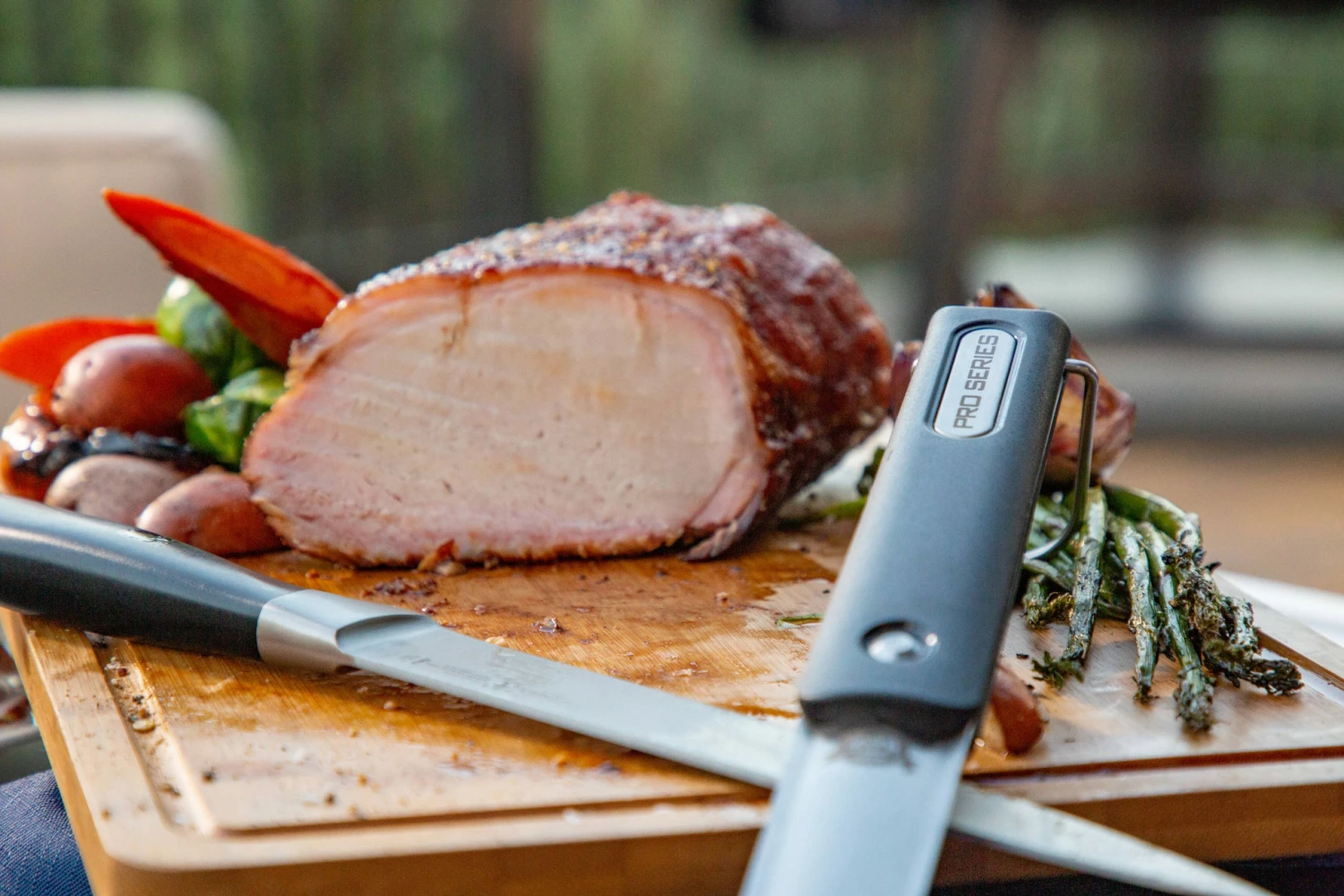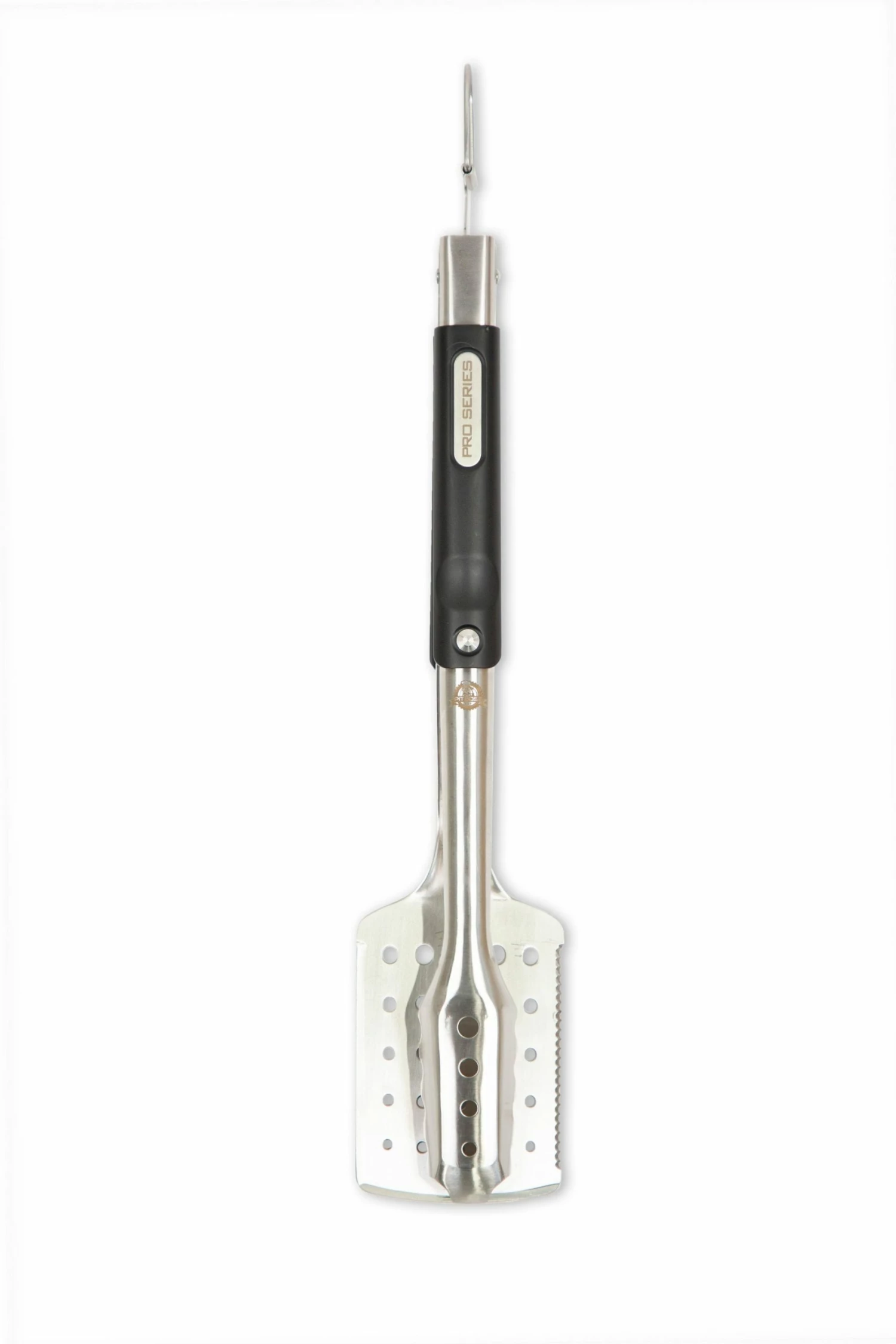Pit Boss grills brings you the same innovation of the pro series grill with the pro series all-In-one tool. This unique design features a full spatula on one side and a raised ridge tong head on the other. You can easily open the tongs to a wide angle, and securely grip and flip a rack of ribs, thick cuts of steaks, large briskets and more. The double-thick stainless-steel construction offers durable and long-lasting use. In addition, an extra-long handle allows for grilling at a comfortable distance away from the grill heat while the nylon polymer grip provides heat resistance of up to 400Ð F. the spatula has a multi-functional build that boasts a meat cleaver on one edge and a serrated tenderizer on the other and a convenient built-in bottle opener on the handle while surface holes on the spatula and tong head creates convenient drainage when handling food. Additional features include a locking tab that pulls in and out for easy storage and an enlarged hanging loop for effortless storage.