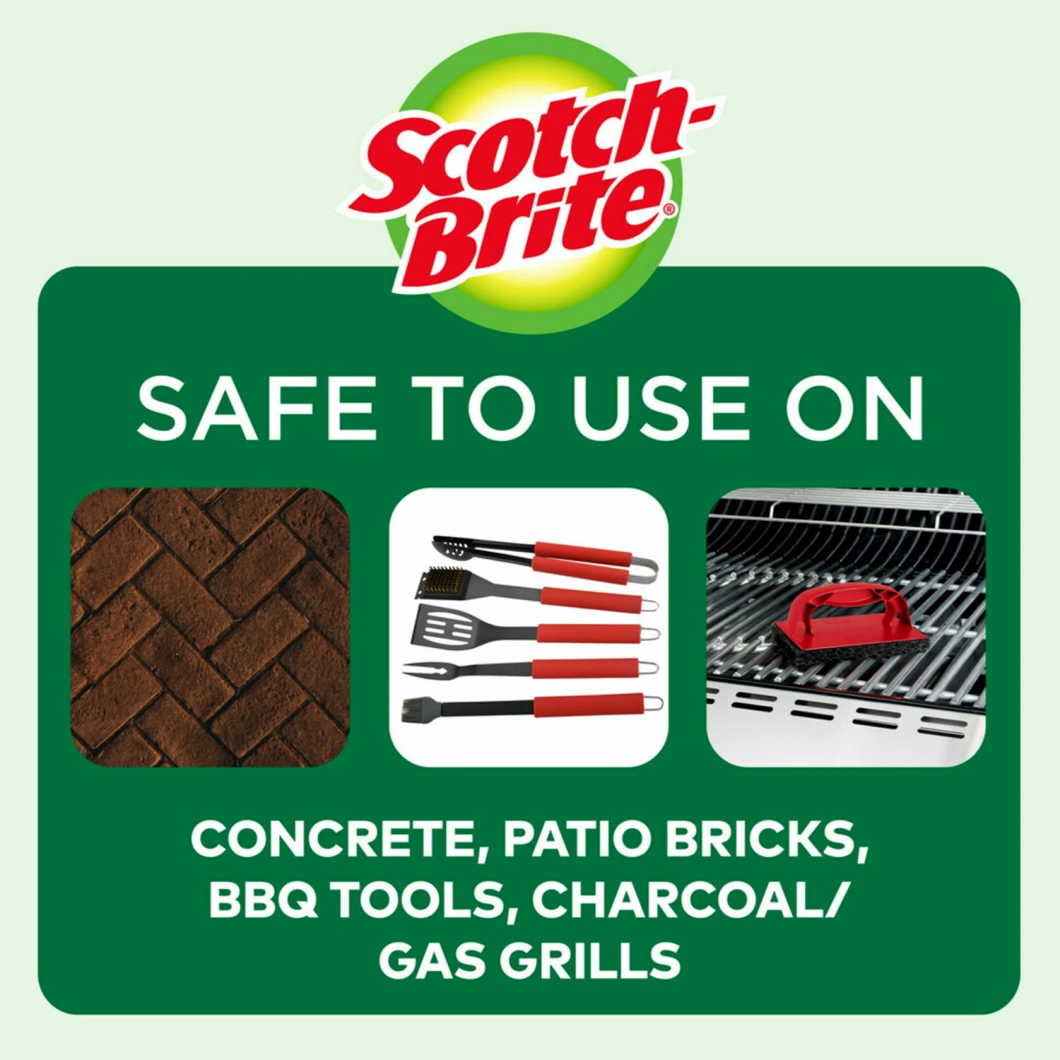 The Scotch-Brite® Grill Scrubber makes it easy to remove burnt-on messes. It is ideal for concrete and patio bricks and BBQ tools! Scotch-Brite® Grill Scrub is a effective cleaning tool with a mineral-coated scrubber to remove burnt-on food and grease quickly and easily. The tough, long lasting-scrubber restores the shine to metal racks, ideal for charcoal, gas and electric.