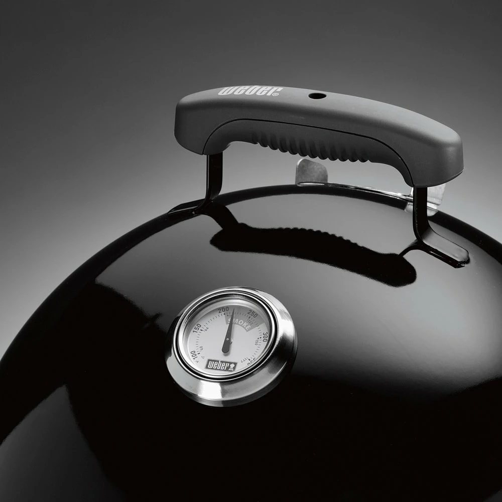 - The Smokey Mountain Cooker Smoker in Black with comes with a water-resistant cover and built-In thermometer